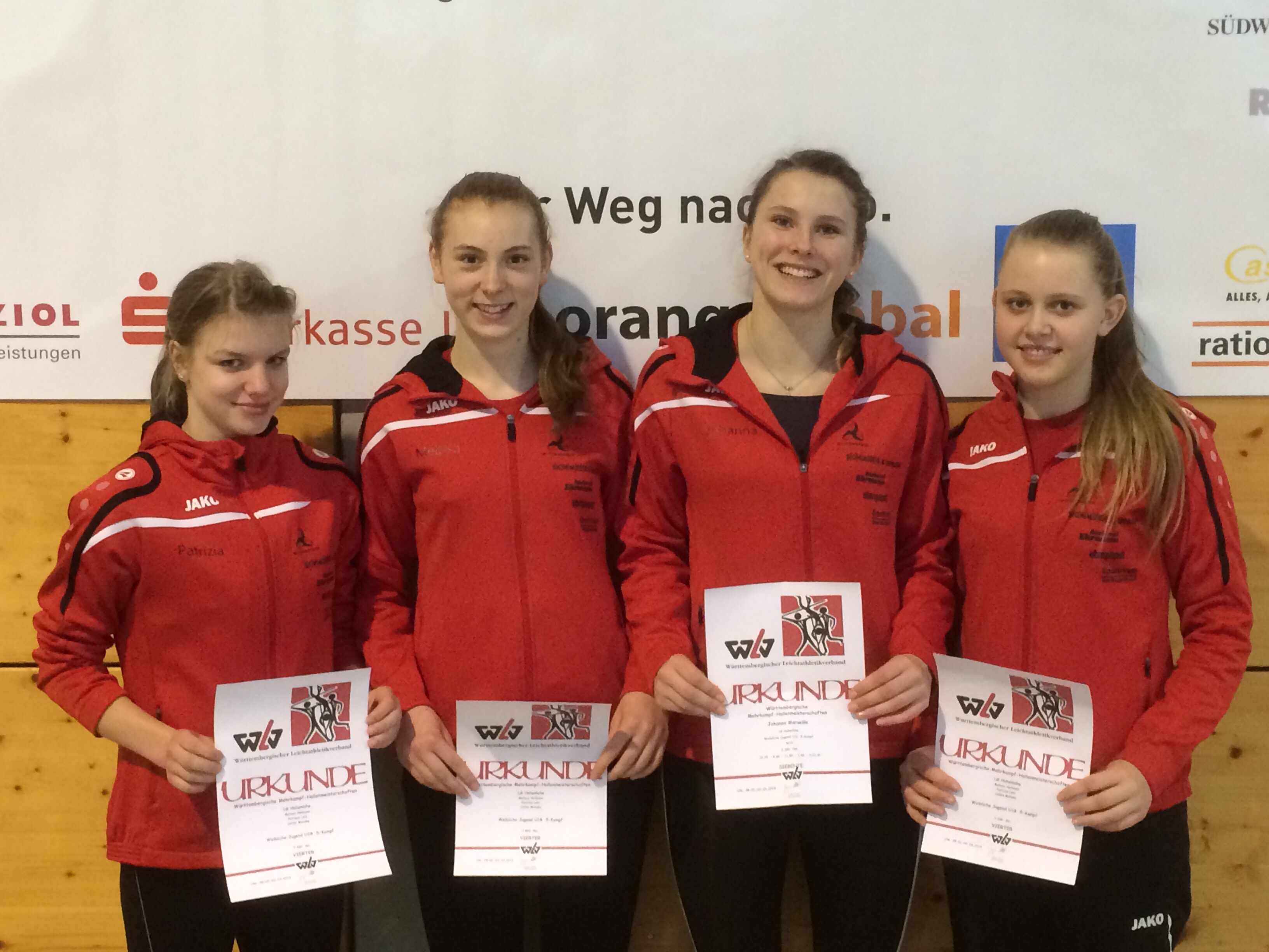 4 Disziplinen geschafft, im Ergebnis doch sehr ordentlich. Auch die Mannschaftswertung der WJU18 wieß plötzlich den geteilten 3.Platz aus, lag man doch vorher zunächst auf Rang und 5 und dann auf Rang 4. Den Gesichtern war abzulesen, dass ein 4-Kampf eigentlich allen reichen würde. Um den 3. Platz zu verteidigen durfte keine Läuferin aus Riederich vor einer LG Hohenlohe Läuferin ins Ziel kommen. Das gelang leider nicht ganz, so dass wir in der Summe Sekunden und den 3.Platz abgeben mussten. Sprinten, Springen und Stoßen sind ja kurze Aktionen, aber nach 2/3 der Strecke ging den Rekonvaleszenten dann doch die Kraft aus. Melissa erzielte allerdings mit 2.52 Minuten eine Zeit, die nur 2 Sekunden über ihrer Freiluft-PB liegt. Mit Schnupfen als sehr gute Vorstellung zu bewerten.