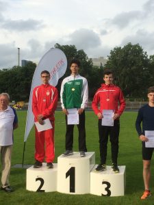Bei den Süddeutschen Meisterschaften flog Hagen Weigand von der LG Hohenlohe zu einer neuen PB von 12.84m im 6.Versuch und eroberte sich damit das Treppchen. Der Konter des bis dahin auf dem 3.Rang liegenden Dreispringer blieb aus. Hagen begann mit guten 12.71m, was auch schon PB bedeutete, ließ gute Sprünge folgen und dann den 5. Durchgang aus, um Kräfte zu sammeln. Diese brachte er dann in einen schnellen Anlauf ein. Ein schneller und flacher Hopp, gefolgt von einem weitem Step und abgerundet durch einen hohen Jump mit guter Landung ergaben dann genau diese 12.84m, die ihm die Bronzemedaillie der MJU 18 im Dreisprung einbrachten. Seit dem Ländervergleichskampf im letzten Sommer hat sich Hagen um rund 1.5m gesteigert. Sehr beachtlich. Wie schon vor Ort, möchte ich auch hier noch mal herzlich gratulieren. Das war eine saubere Vorstellung!