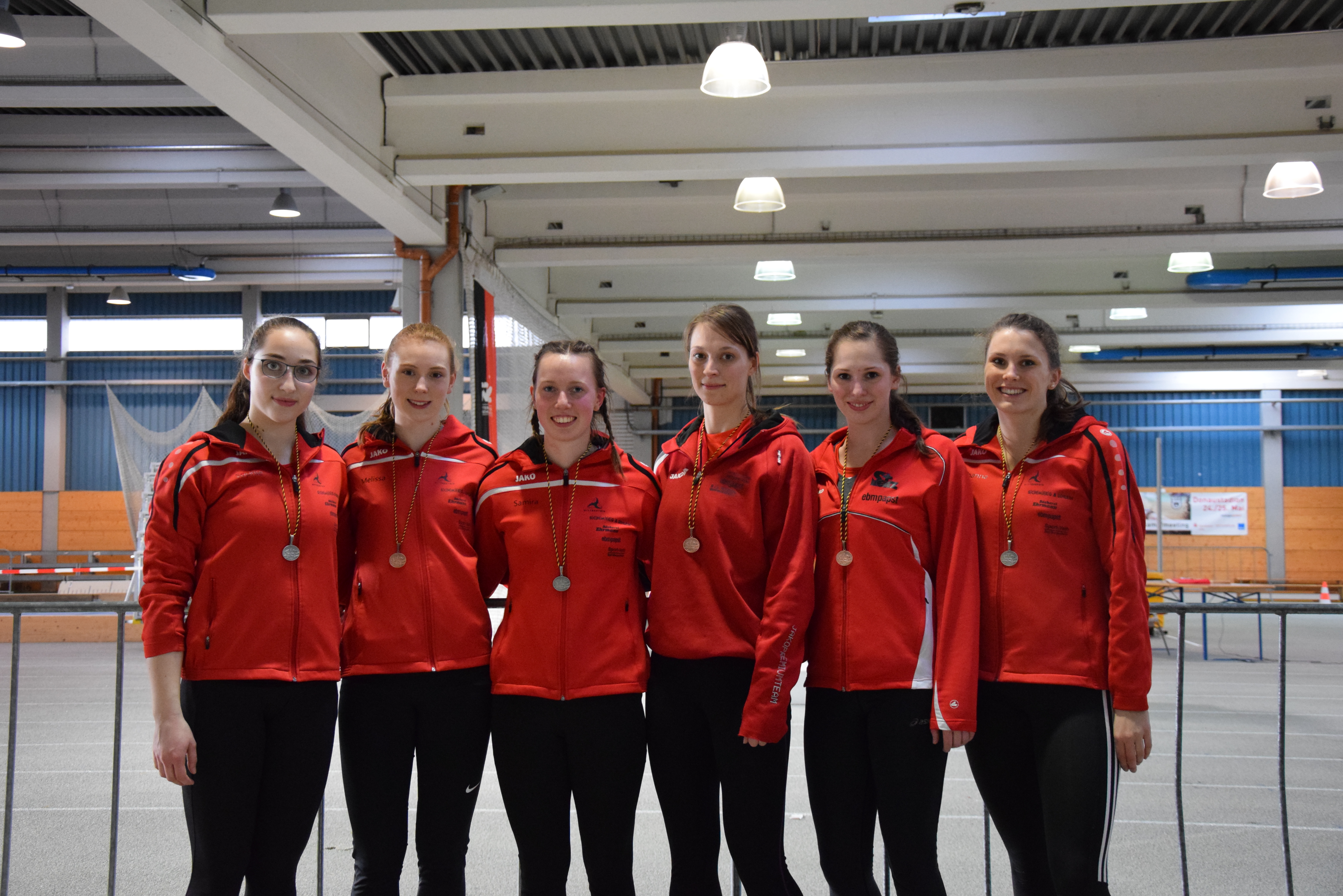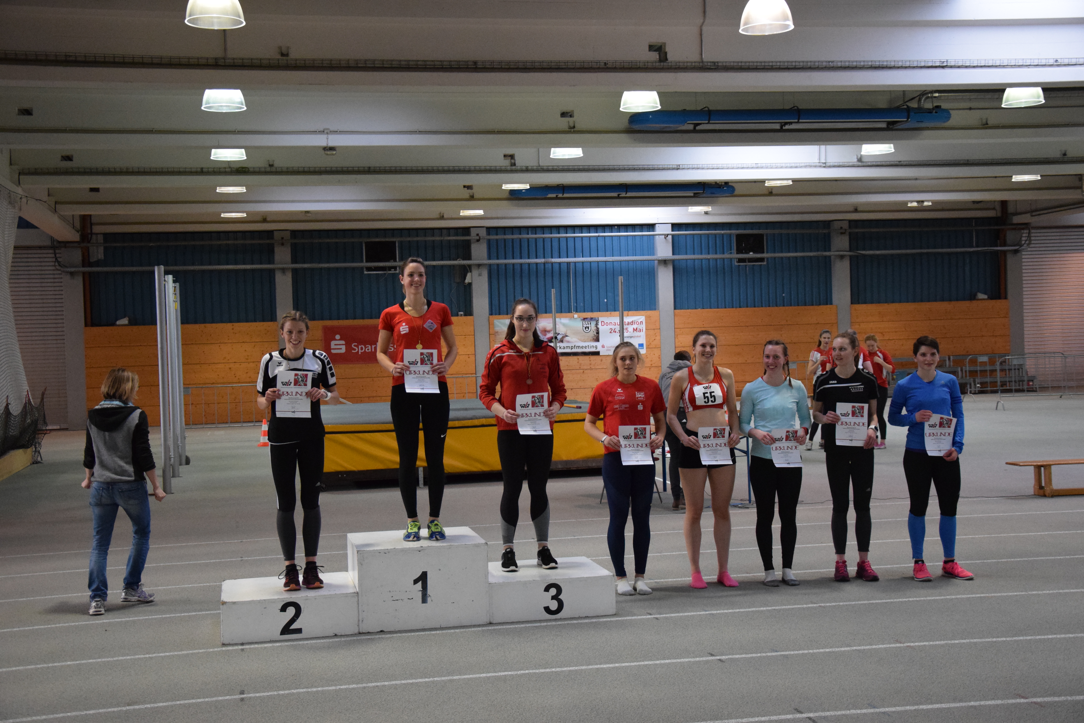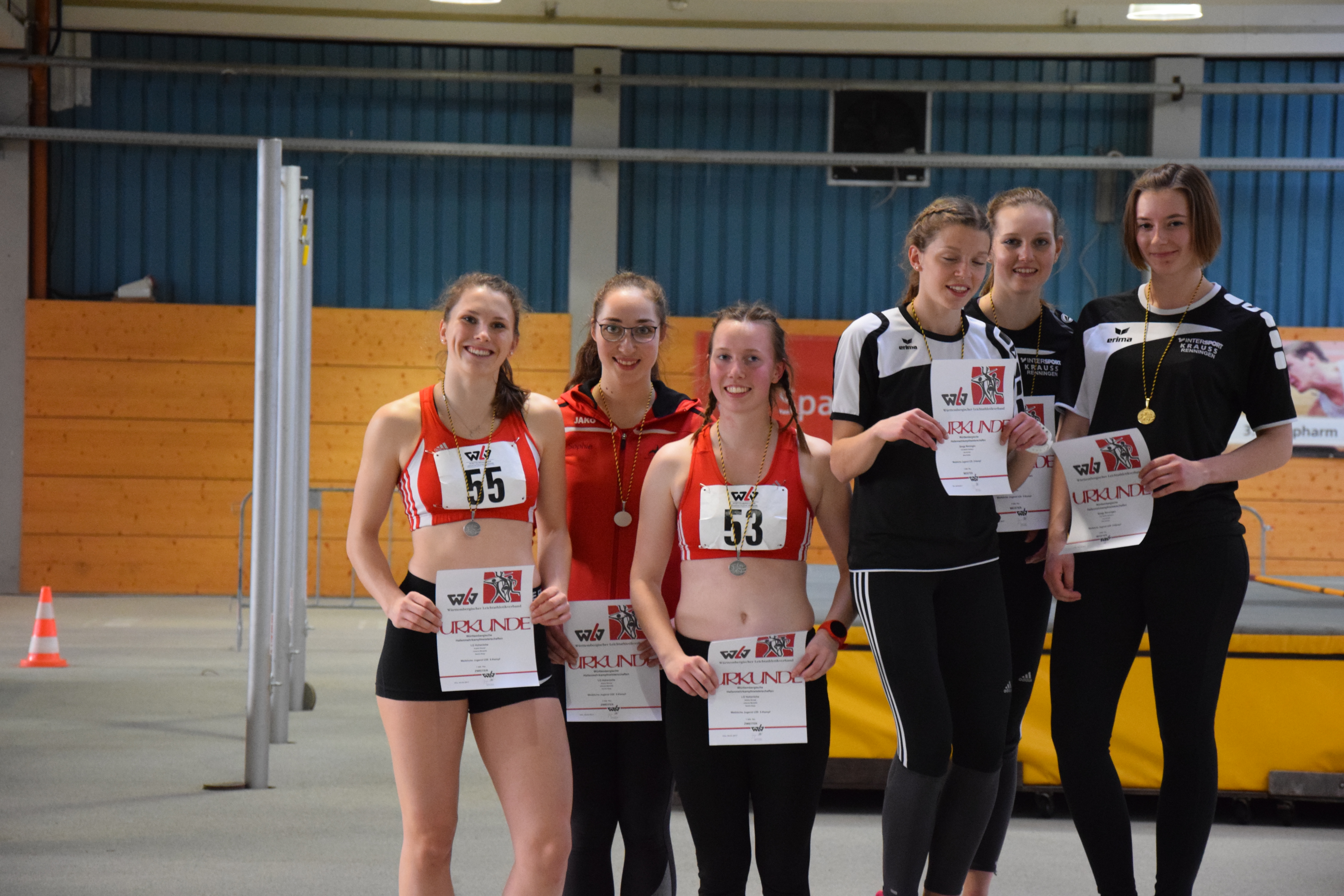 Samira Bopp, Johanna Marseille und Sophie Stumpf traten in der U20 an. Zwar gehören Johanna und Sophie noch der U18 an, doch nur so ergab sich die Chance auf eine Mannschaftswertung. Um 10.00 Uhr durften sie mit der Kugel ran. Hier konnte Sophie die Tagesbestweite erzielen, und auch Johanna und Samira brachten die Kugel im Bereich ihrer Trainingsbestweiten in den Sektor. Dies bedeutete eine schönen Vorsprung auf die zweite Mannschaft im Wettbewerb, doch alle wussten, dass dies nur eine Momentaufnahme war. Als nächstes ging es über die Hürden. Über die ungeliebten 84er Hürden hieß es nur ankommen, und alle kamen ins Ziel – nicht lehrfilmtauglich aber mit vollem Einsatz. Im Hochsprung blieb bei allen die Latte mehrmals liegen, doch zogen hier die Renninger verdient an uns vorbei. Im Weitsprung sprang Sophie nach 4.99m noch genau 5m und auch Johanna und Samira kamen zufrieden aus der Grube. Nach 4 Disziplinen lag Sophie auf dem 3 Platz. Ihr Vorsprung vor dem 800m Lauf auf Platz 4 betrug rund 300 Punkte auf Platz 5 notierte Johanna. Eileen Biedermann ist aber als gute Läuferin bekannt und, nun ja, Sophie eher nicht. Also wurde der Mehrkampfrechner bemüht um den Vorsprung in Sekunden umzurechnen. Im Ergebnis durfte Sophie „nur“ 30 Sekunden auf Eileen verlieren. Mit Rundenzeiten versehen die sich an ihren Vorleistungen orientierten lief sie am Ende des Feldes. Vorne demonstrierte Samira Bopp dass Laufen ihre beste Disziplin ist. Als Siegerin mit einer Zeit um die 2.35 Min. machte sie reichlich Punkte gut und kam im Endergebnis auf den 6. Platz. Johanna kam im Mittelfeld knapp noch vor Eillen ein, und für Eileen Biedermann wurden 2.57 Min. gestoppt. Zu dem Zeitpunkt bog Sophie auf die Gegengerade ein und die Uhr tickte gnadenlos herunter. Auf der kurzen Zielgeraden konnte sie noch mal zulegen und die Traineruhr klickte bei 3.27 Minuten. Wieder wurde der Mehrkampfrechner gefüttert jetzt mit den handgestoppten, hoffentlich richtigen Zeiten. Hat es noch gereicht? Johanna wurde als 5 aufgerufen. Eileen hatte sich bis auf wenige Punkte herangelaufen, aber der 3. Platz blieb Sophie hauchdünn erhalten. Glück gehabt!