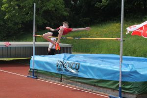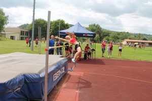 Bei einer anderen Station war das Motto: Fliegen mit Stäben. Die Kinder erlebten wie sich Stabhochspringer fühlen. Ein Absprung mit dem Stab vom Kasten auf die Matte. Viel Freude bereitete auch die Biathlon-Staffel. Jedes Kind das beim „Schießen“ nicht traf, musste eine Strafrunde laufen. Das „Schießen“ war der Wurf mit einem Ball durch die Öffnungen der in 2 Meter Höhe aufgehängten Zielscheibe.