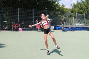 Sprint – Sprung – Wurf, in allen Bereichen waren die Athleten der LG Hohenlohe/1. FC Igersheim bei den Frankenmeisterschaften in Neckarsulm erfolgreich. 33 Podestplätze Untersteichen die Leistungsstärke der Igersheimer. Hier Marlene Stegers beim Ballwurf.