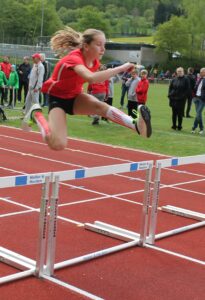 Marlene Stegers vom 1. FC Igersheim beim Hürdenlauf in Aalen-Unterkochen. Neben dem 60-Meter Hürdenlauf, bei dem sie in 11,22 Sekunden den 2. Platz belegte, gewann sie im Ballwurf mit 40,50 Meter.
