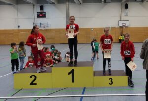 Foto: Beim Hallensportfest in Crailsheim war die LG Hohenlohe/1.FC Igersheim stark vertreten. Sie stellten die meisten Teilnehmer und konnten zahlreiche Siege einfahren. In der Klasse W10 siegte Maren Korn, auf den 3. Platz kam Jule Schwab und den 4. Platz erreichte Sophia Götz.