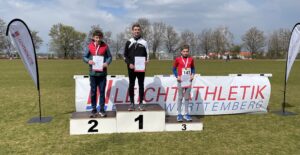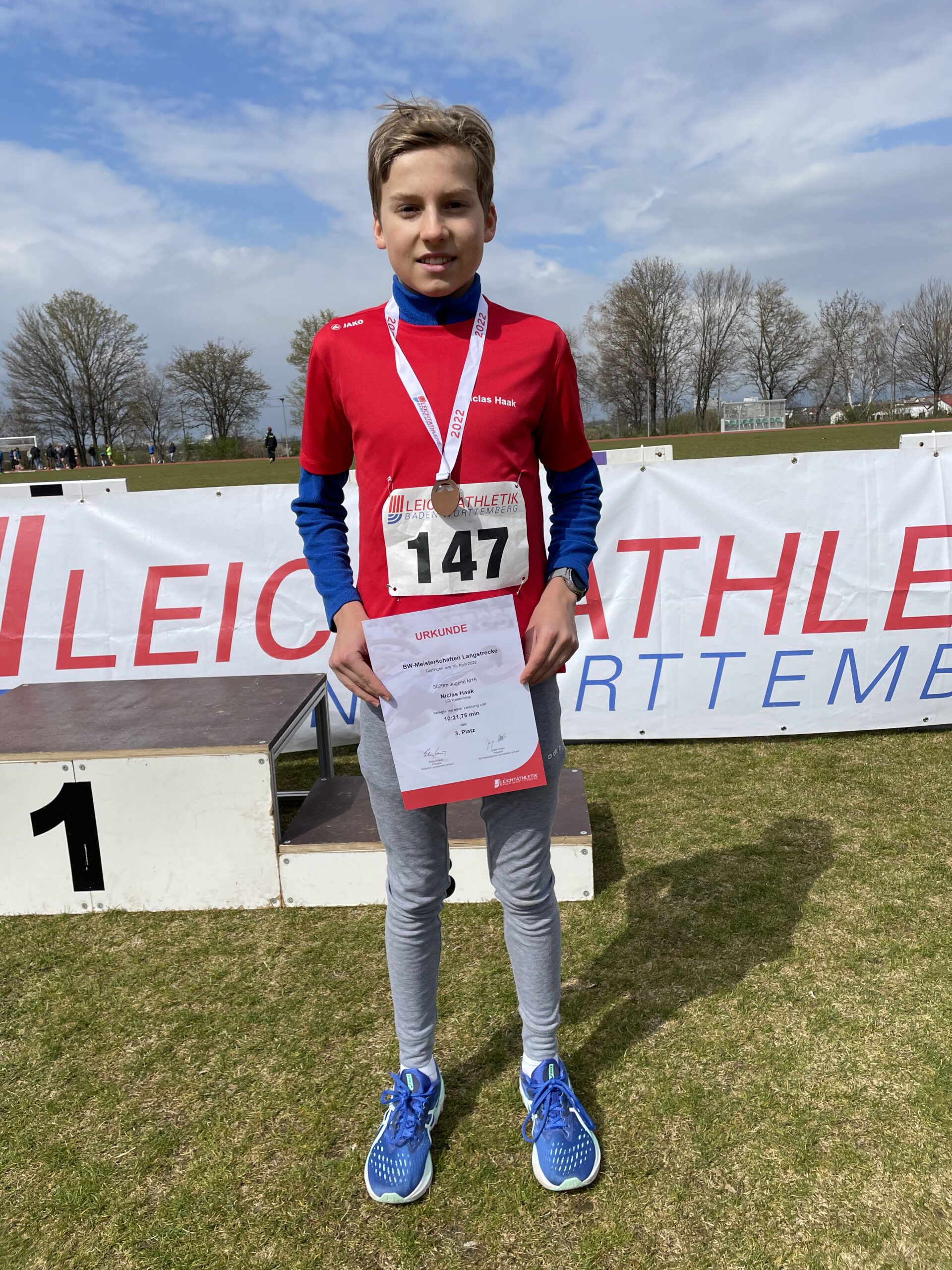 Am 10.04.2022 fanden in Gerlingen die Langstreckenmeisterschaften des Landes statt. Bei kühlem aber trockenem Wetter ohne störenden Wind starteten die Wettkämpfe um 13.00 Uhr. Niclas Haak von der LG Hohenlohe startete über die 3000m der M15. Bei Meisterschaften gleich das erste Bahnrennen der noch sehr jungen Freiluft-Saison zu absolvieren ist eine besondere Herausforderung. Niclas hatte aber den Winter sehr viel und abwechslungsreich trainiert, so dass wir mit dem Ziel „Bestätigung der Bestzeit aus 2021“ ins Rennen gingen und für die Runden 1.24 Minuten festlegten. Das Feld schlug gleich ein gutes Tempo an, 1.20 Minuten für die erste Runde, doch Niclas hielt sich hinten im Feld auf und lief sein Tempo. Nach 1000m hatte er sich auf den 3. Platz seiner Altersklasse vorgearbeitet und lief in einer Gruppe, gemeinsam mit Läufern des jüngeren Jahrgangs, windgeschützt seine Runden. Nach weiteren 1000m waren die Ränge 1 und 2 enteilt, Mitbewerber um den Bronzerang sicher distanziert, so dass es jetzt darum ging das Tempo hoch zu halten und einen langen Schlussspurt einzuleiten. Nach 10:21,75 Minuten, gleichbedeutend mit einer persönlichen Bestzeit, war die Ziellinie erreicht. Herzlichen Glückwunsch zur ersten Medaillie für Niclas Haak in 2022.