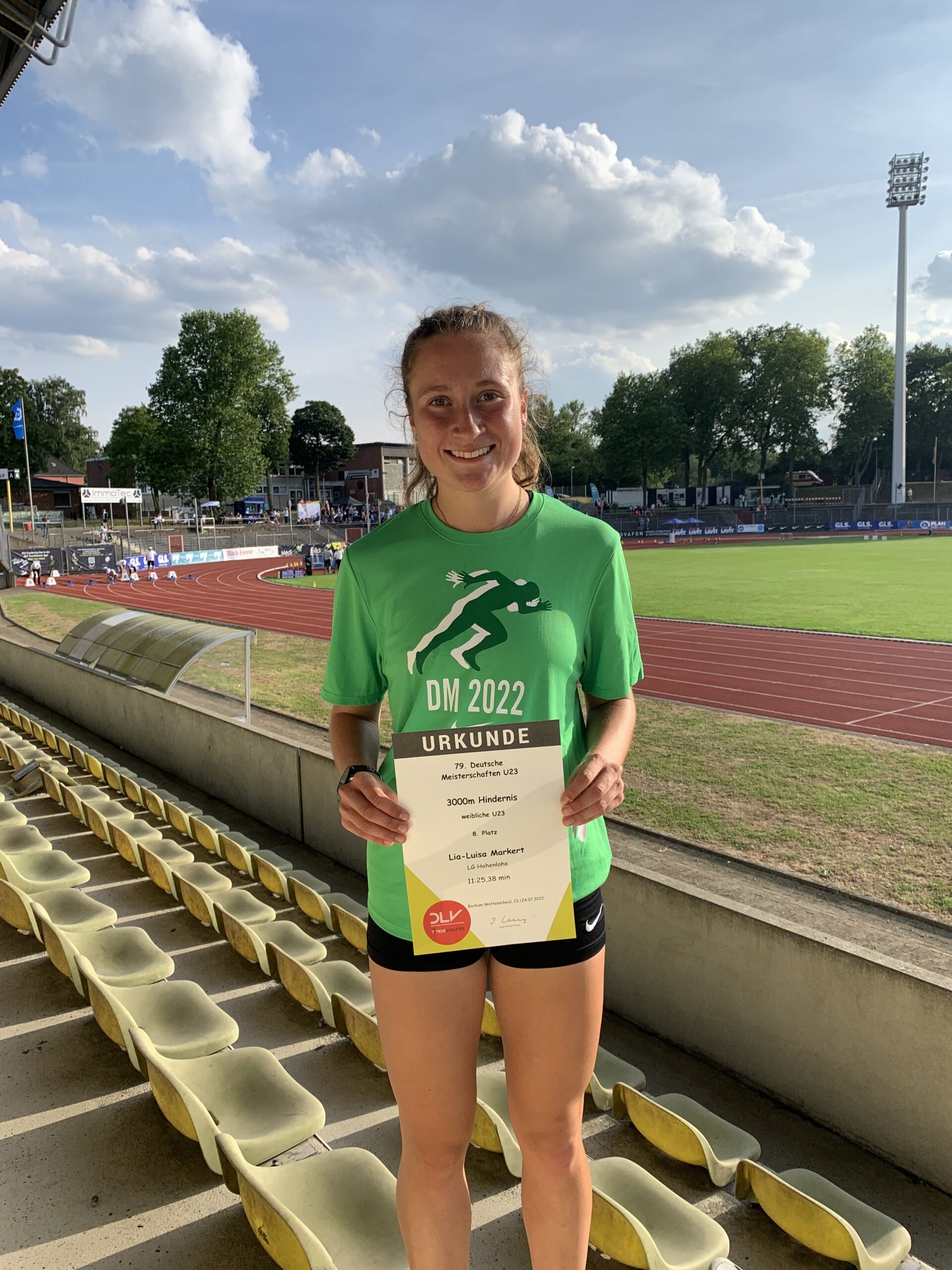 Lia-Luisa entstammt dem Jahrgang 2003 und gehört noch der U20 an. Die Urkunde vom 8.Platz einer U23 DM hat somit einen noch höheren Wert, bleiben ihr ja noch 3 Jahre der Entwicklung für diese Altersklasse. Dieses große Potential haben auch die Rekrutierer ihrer Universität erkannt und Lia-Luisa für ein weiteres Jahr zu deutlich besseren Konditionen unter Vertrag genommen.