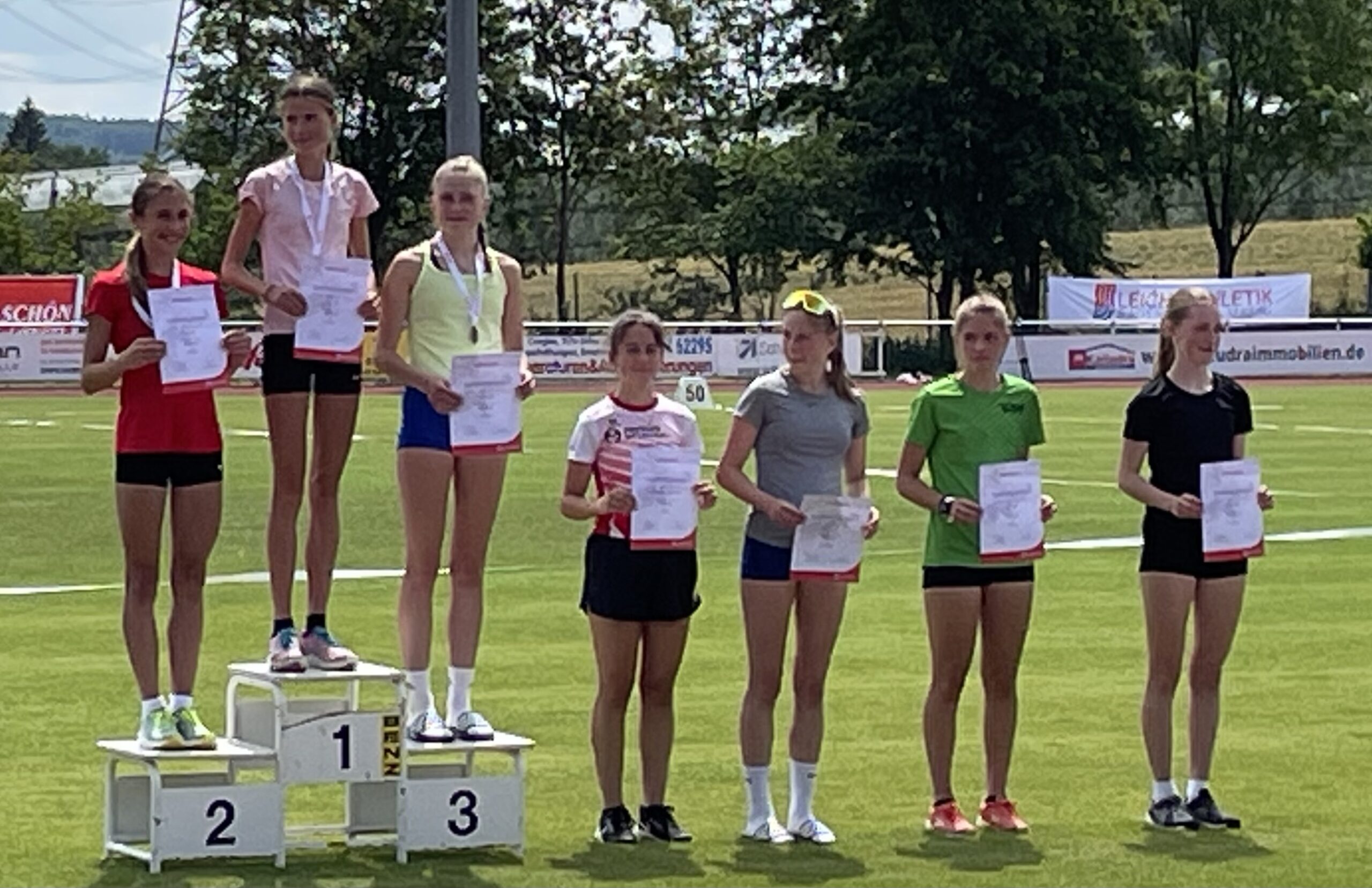 Um 11.15 Uhr schoß der Starter das gemeinsame Feld aus WJ U18 und WJ U20 ab und das Feld reihte sich schnell in langer Kette ein. Marie hatte sich gut orientiert und verfolgte Louna Schuler direkt, ihre nach Meldezeit gefährlichste Konkurrentin um Silber. Julia Ehrle, WJ U18, und Bianca Böhnke aus der WJ U20 setzten sich gleich deutlich ab. Louna Schuler schlug ein Renntempo von knapp 10 Minuten auf 3000m an, und da sie in diesem Jahr über diese Strecke noch nicht in Erscheinung getreten war blieb nur eins – Marie musste das für sie zu hohe Tempo annehmen und durfte Louna nicht ziehen lassen. 3.18 Minuten zeigte die Uhr nach 1000m. 3 Runden vor Schluss wurden beide deutlich langsamer, bei 2000m zeigte die Traineruhr 6.48 Minuten. Kurz vor dem Gong zur letzten Runde überholte Marie Louna und konnte sich dann Meter für Meter absetzen. Mit dem Zielbogen presste Marie alles aus sich heraus, was nach diesem harten Rennen noch in ihr war und erkämpfte sich die Silbermedaille. Vor ihr nur Julia Ehrle.