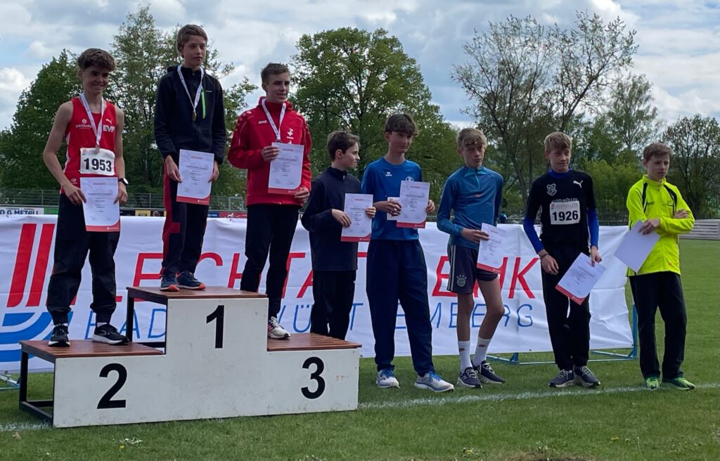 Den Beginn um 13.30 Uhr machte Lukas Frank, M14, im Rennen der MJ U16 über 3000m. Gemeinsam mit den Läufern der M15 ging es gleich flott los. Die ersten Runden wurden in ca. 80 Sekunden gelaufen, mittendrin Lukas, der sich geschickt an der Innenkante eingereiht hatte und im Windschatten Kräfte sparte. Nach ca. der Hälfte des Rennens setzten sich 4 Läufer der M15 an die Spitze des Feldes, dann folgten vereinzelte Läufer der M14. Lukas folgte dahinter in einer 4er Gruppe, die im Tempo allerdings zusehends abfiel, so dass sich der Abstand nach vorne unerfreulich vergrößerte. 600m vor dem Ziel begann Lukas jedoch sein Tempo zu steigern, verließ die Gruppe und machte sich auf die Verfolgungsjagd. Im langgezogenen Schlussspurt überholte er noch 2 Läufer und kam in 10.27,50 ins Ziel. Erfreulich zeitnah wurden die Siegerehrungen durchgeführt, zu denen Lukas als 3. des Rennens der M14 aufgerufen wurde. Gegen laufstarke Konkurrenz erkämpfte er sich die wohlverdiente Bronzemedaille bei seinem Meisterschaftsdebüt über diese Strecke. Es gewann Mattis Ackermann in 10.14,83 und Vize-Meister wurde Tom Schröder 10.20,99