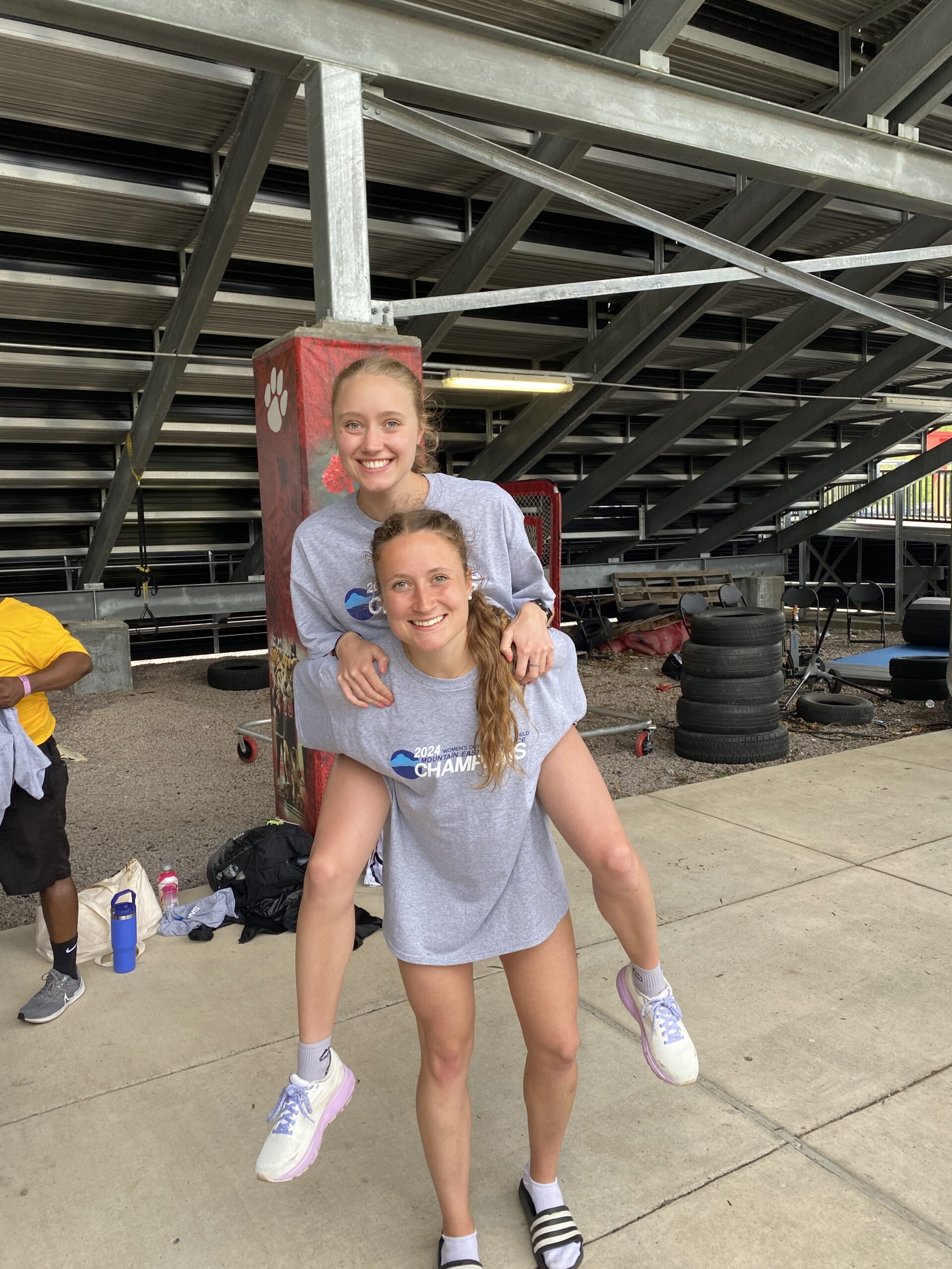 Traditionell gibt es ein Meisterschafts-T-Shirt. Trotz 3 anstrengenden Wettbewerben kann Lia-Luisa ihre Kollegin noch Huckepack nehmen.